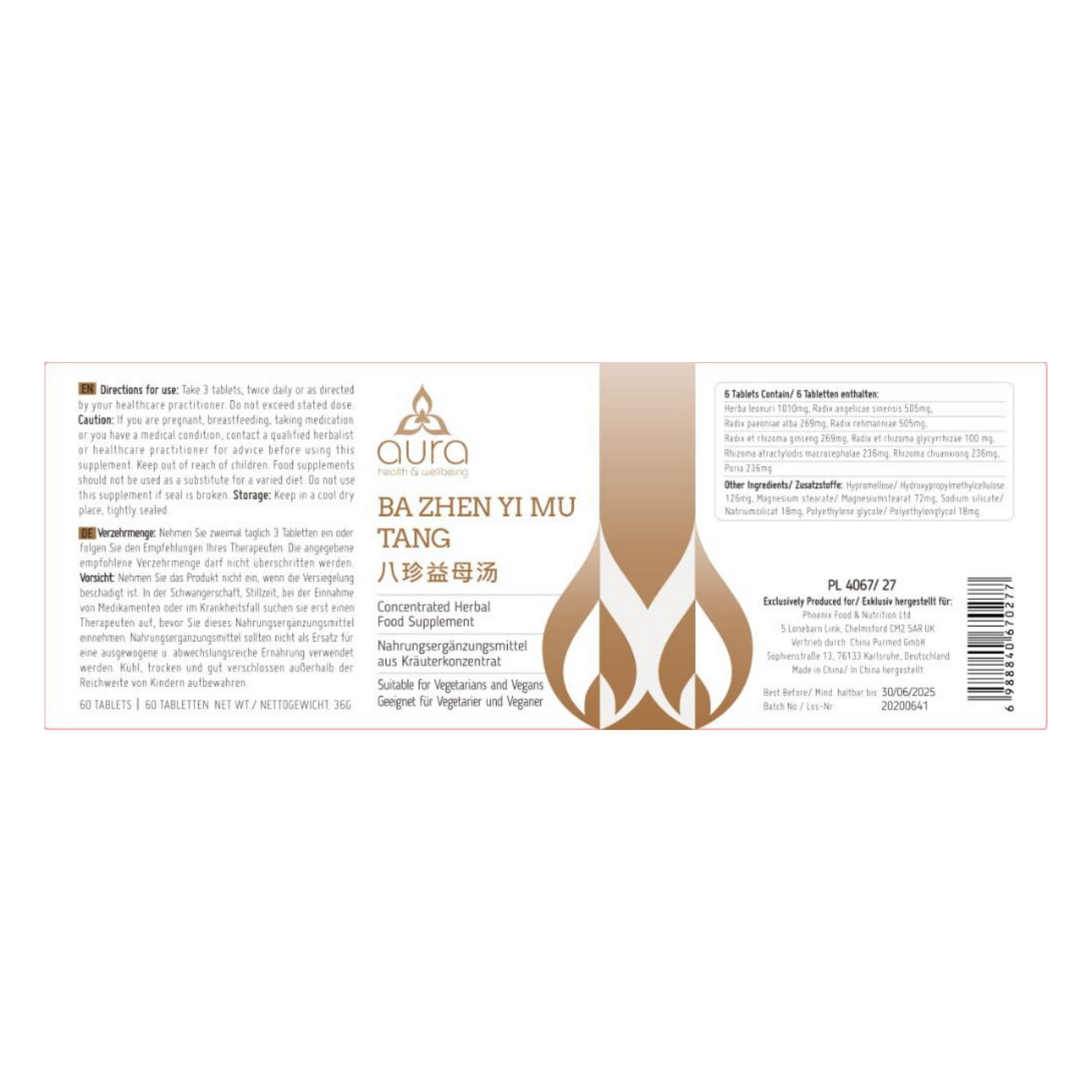 •Radix rehmanniae (Sheng Di Huang) 505 mg•Radix paeoniae alba (Bai Shao) 269 mg